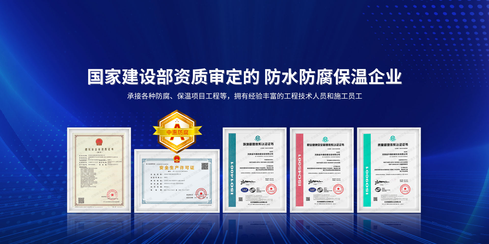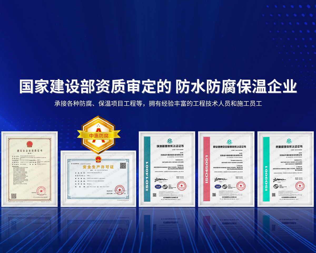 公司經營范圍:防水防腐保溫工程;消防設施工程;建筑裝修裝飾工程;建筑機電安裝工程;電力工程;建筑工程;石油化工工程;工業清洗工程;油罐清洗工程;鋼結構工程;環保工程;模板腳手架工程;電纜防火封堵、防污閃噴涂、外墻外保溫工程;各類施工勞務作業;設備維修、船舶鉚焊、涂裝;電力工程材料、建材、防水材料、防火材料、防腐保溫材料銷售,并相繼通過了GB/T19001-2008idtISO9001:2008GB/T50430-2007質量管理體系認證證書。GB/T24001-2004idtISO14001:2004環境管理體系認證證書。GB/T28001-2011idtOHSAS18001:2007職業健康安全管理體系認證證書。公司是中國防腐蝕于防護協會、中國施工企業管理協會、電力協會和中國鋼結構防水協會會員單位。 公司的經營業務涵蓋了石油、化工、電力、冶金、煤炭、船舶、國防、燃氣、水利、環保、交通運輸、航空及國防軍工和輕紡市政等行業的防腐保溫絕熱設備。鋼結構安裝、防火、防水、金屬噴鍍、聚脲噴繪、陰極保護、防滲透堵漏、玻璃鋼及各種磚版材料襯里、橡膠襯里、煙氣硫和耐酸溶劑腐蝕等工程施工。公司連續十年榮獲“省市先進施工企業”“安全生產先進單位”“重合同,守信用企業”和“AA***資質企業”的稱號。2000年被命名為市級文明單位,2002年被國家工商行政管理局命名為“重合同,守信用的企業”、被中國工業防腐蝕技術協會命名為“防腐蝕企業,能源節約及環境保護領域有豐富的經驗和***的業績。工程一次交驗合格率100%。其中攀枝花鋼鐵公司煉鐵廠四號高爐及熱風爐防腐工程、上海寶鋼公司煤氣柜防腐工程、撫順石油一廠裝置防腐項目、齊魯石化公司稀烴廠高塔防腐工程、吉林化學工業公司煉油廠油罐防腐工程、天津石化熱電廠六號爐頂棚聯絡管保溫工程、大慶油田(太倉)力神泵業工程、中國化學工程第十一建設工程、中原油田勘探局工程、中國石化銷售有限公司華北分部、魯皖輸油管道工程、貴州開磷息烽合成氨工程、陜西黃陵煤化工程、中國石油天然氣西部管道塔里木輸油工程、邯鋼集團邯寶鋼鐵公司煉鐵工程、德州供電工程、吉寶(南通)船廠工程,偃師華潤熱力工程、鄭州熱力總公司。 河南省中惠防腐安裝有限公司愿以豐富的施工經驗,***的技術,***的設備,***的管理,***的服務,竭誠為國內外廣大的用戶提供***滿意、******的工程作品。 我公司愿與國內外同仁一道,團結協作,共同推進防腐蝕行業發展! 公司地址:河南省長垣縣建設路北段360號 固定電話:0373-8866488 郵編:453400 網址:http://www_zhff_com_cn.kynwt.com